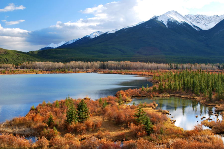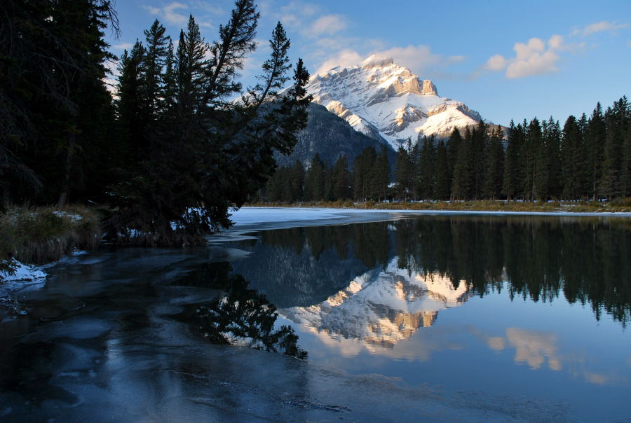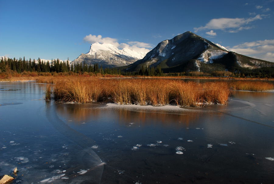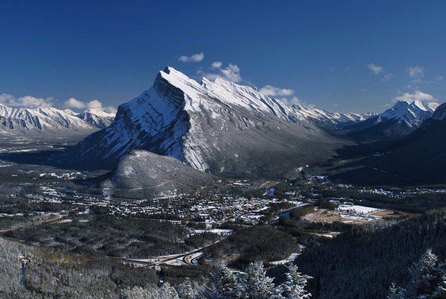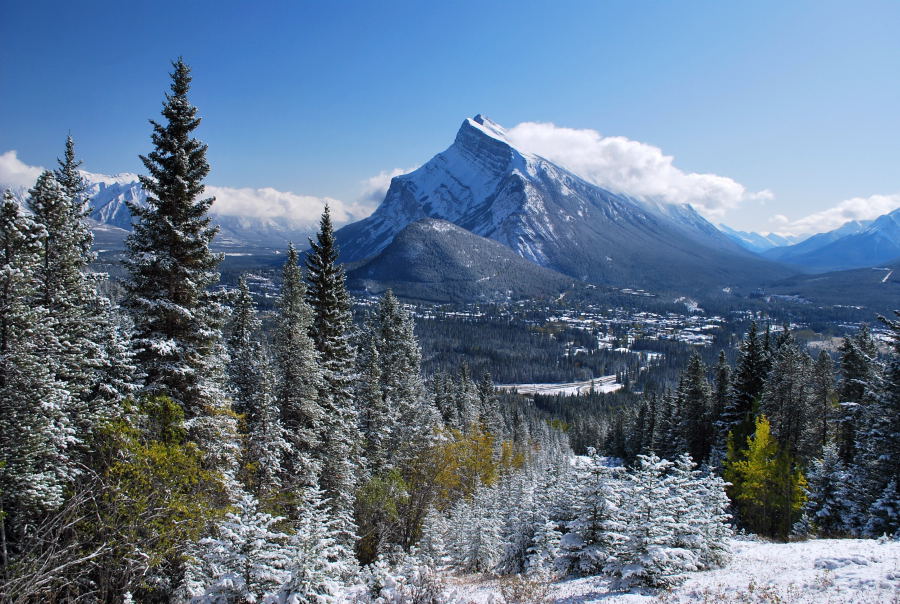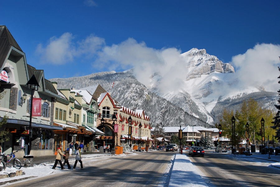 バンフも11月に入り、秋から冬になりました。バーミリオンレイクやボウ川も凍り始め、写真の良い材料です。秋から冬へ変わるバンフの写真を送ります。11月の中旬にはBanffからVancouverにもどります。 雪のバンフアベニューとカスケード山。
