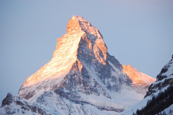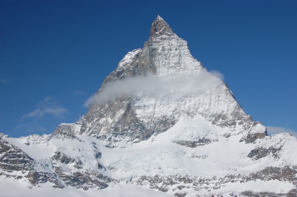ロープウエイでシュワルツゼー(黒い湖)経由でトロッケナーシュテークに登ると、マッターホルンの東壁が正面に見える。右の稜線がスイス側登山ルートのヘルンリ稜、左の稜線がイタリア側登山ルートのフルッケン稜です。