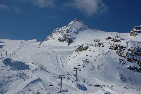 トロッケナーシュテークでロープウエイを降りると、広大なスキーエリアが広がります。左のスキー場の上はイタリアとの国境でスキーでイタリアに行けます。シュバルツゼーへ向かって快適なピステを滑って行きます。