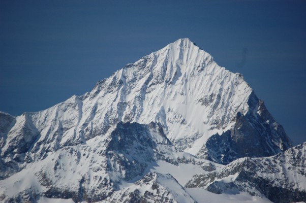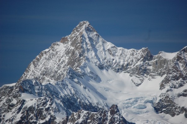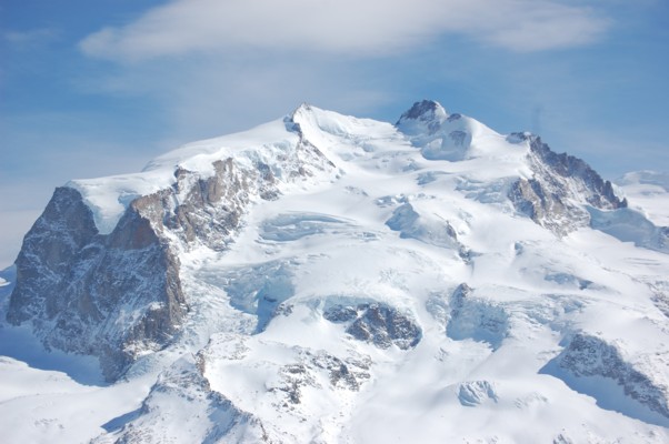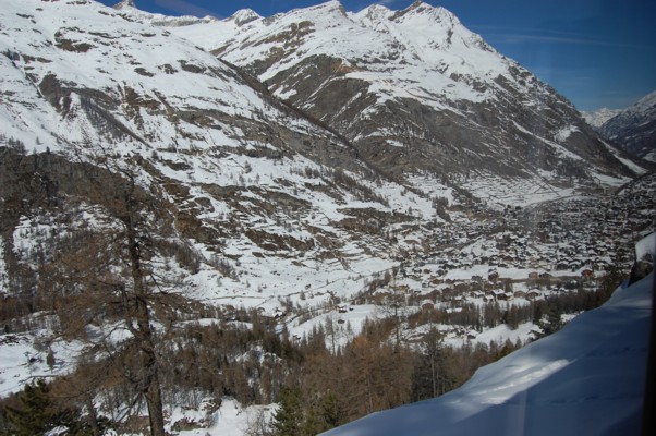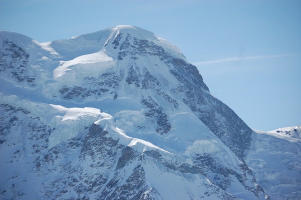 ゴルナーグラートからはツェルマットを囲むワリスの山々が見渡せる。多くの人がくつろいでいる屋外のレストランを抜け、雪の展望台を出ると、360度の山々の展望が広がる。白い雪に覆われたモンテローザ。1953年人類初の8000メートル峰アンナプルナ登頂後、凍傷で手と足の指を無くしたモーリス・エルゾーグが傷癒えて登山を再開した山である。