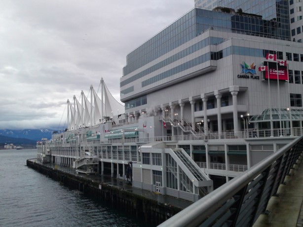 船をイメージした作りのコンベンションセンタがあるカナダプレース。手前の桟橋には大型客船が停泊できる。帆の下辺りにあるカフェで、海を眺めながらくつろぐ。