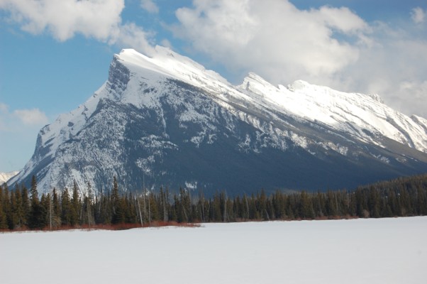 郊外のバーミリオン湖からは凍った湖の背後にランドル山の西側の雪の斜面が望まれる。