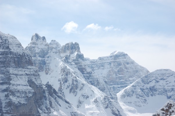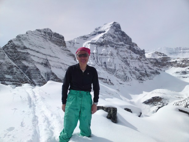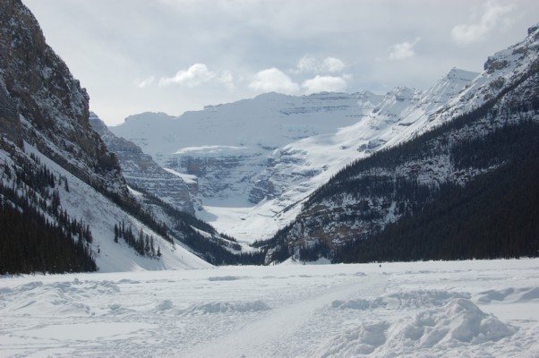快晴の天気に恵まれた24日、ルイーズ湖にでかける。凍った湖の正面にビクトリア山の障壁が白く輝いている。