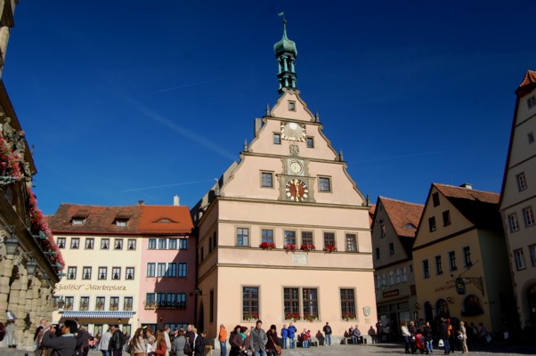 快晴の日曜日、息子のBMWでフランクフルトを出発する。すぐに森の中の3−4車線のアウトバーンに出る。平均時速140Km位。追い越し車線の車は180Km位。2時間位でロマンティック街道の中心、ローテンブルクに着く。城壁をくぐり、石畳の道を市内に入る。中世の町並みが美しい。市長舎のあるマルクト広場では大勢の人が町の散策を楽しんでいる。