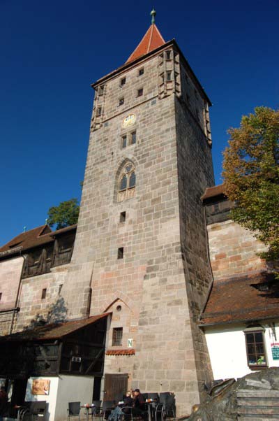城を下ってくると、城壁の塔が見下ろしている。辺りはカフェがあり、ニュールンベルク名物の細いソーセージを焼いてザウアークラフトを付け合せにしたメニューが嬉しい。白ビール(Weissbier)と一緒に昼ごはんを楽しむ。