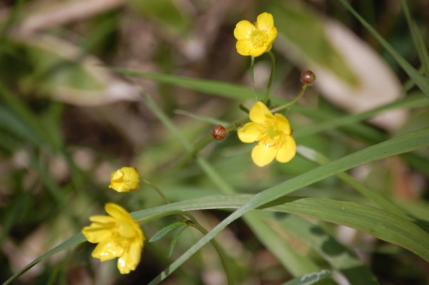 Small and yellow flowers of buttercups are seen near the mountain trail.