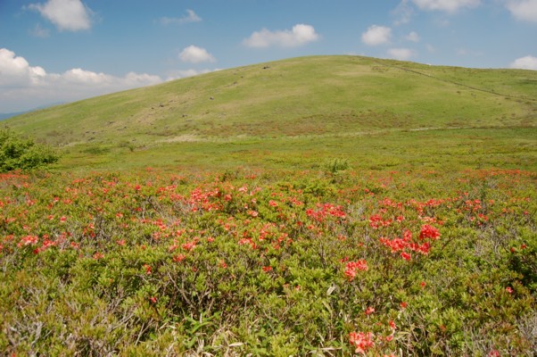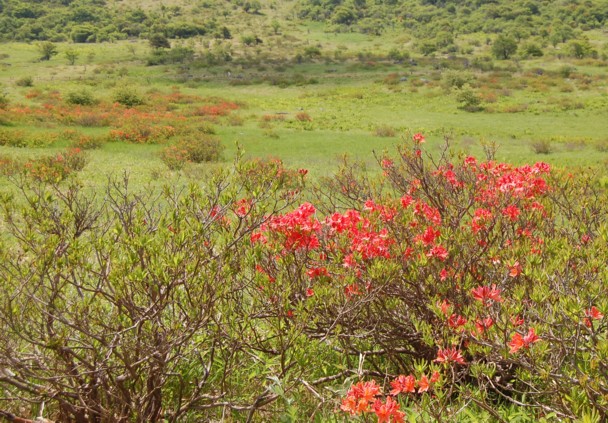 I went hiking to Mt.Kirigame on a sunny Saturday. I drove through the grassland of clear air and shining sun of more than 1600m. When I started walking in the marshland, a lot of orange flowers of azaleas were blooming there. The surface of the marshland was like an orange patchwork seen from a distance.