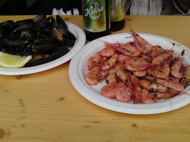 港の市場では豊富な魚貝類が並び、屋台でエビとムール貝を焼いてもらってビールと一緒に食べる。
