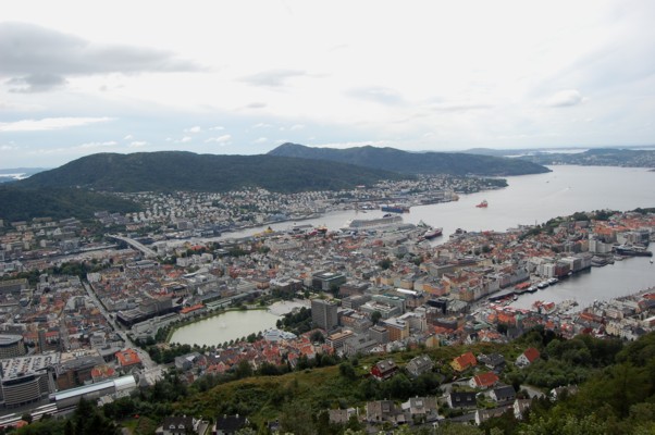 裏山のフロイエン山へケーブルカーで登ると、赤と白で統一された町並を一望できる。右下の湾奥が魚市場で右側がブリュッゲン。
