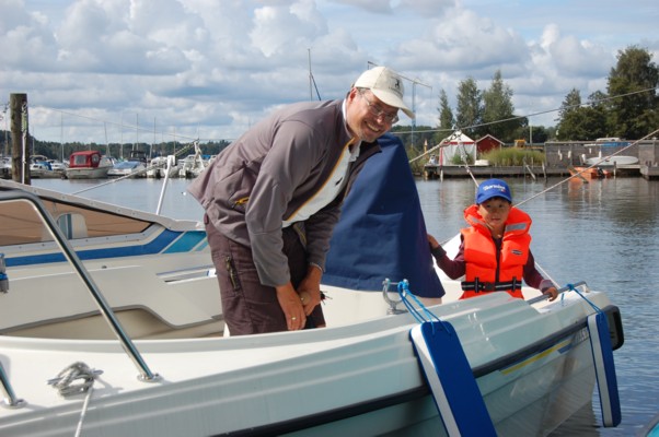 ヨットハーバでは多くの個人の船が停泊している。これから舟遊びにでかける親子に声をかける。