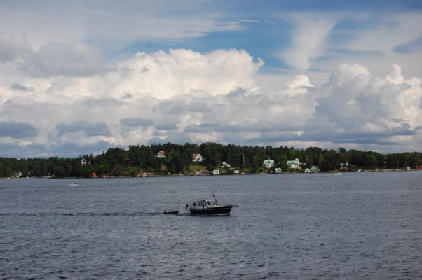 8月8日、ストックホルムから車で40分位のヴァックスホルムへ向かう。ストックホルムの市街地を抜けると、バルト海から続く海が広がり、両岸には黒い森と可愛らしい家が見える。
