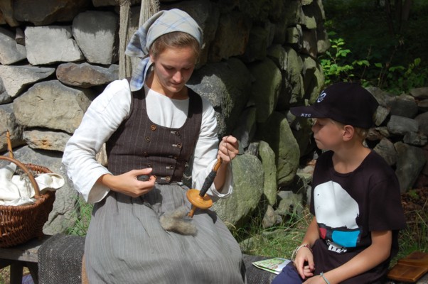 伝統的な服装の女性が子供達に羊毛から糸の造り方を教えている。