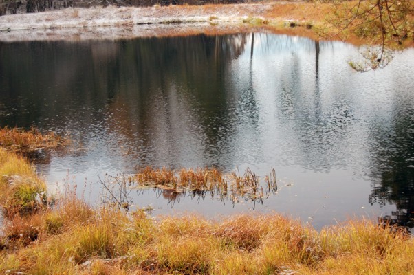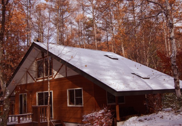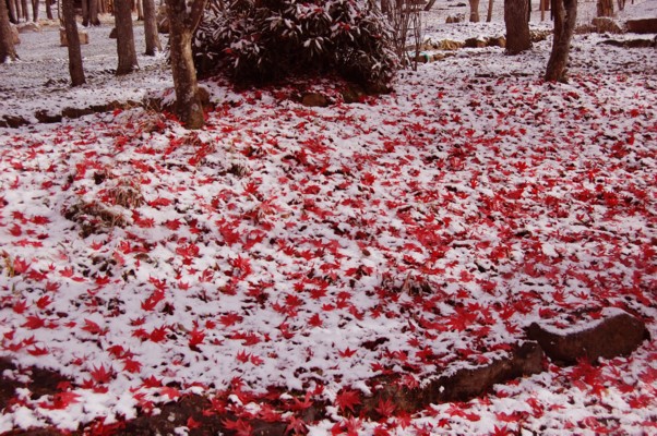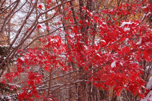 We had several-centimeter snow this morning. The yellow leaves of larch trees are shining at the back yard of our house.