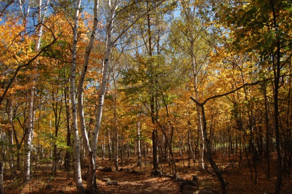 In the forest of white birches, we saw white trunks and yellow or orange leaves.