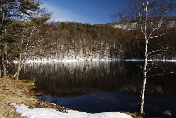 標高の高い所にある御射鹿池も湖面の氷が溶けて、早春の雰囲気が漂っている。