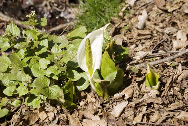 四月に入り、気温も上がって、周りの草原では、一斉に春の草花が咲き始めた。水芭蕉も可愛らしい芽を出し始めた。