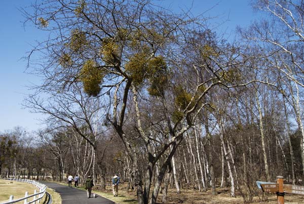 ヤドリギが付いた木の下の散歩道では、多くの人が歩いてる。