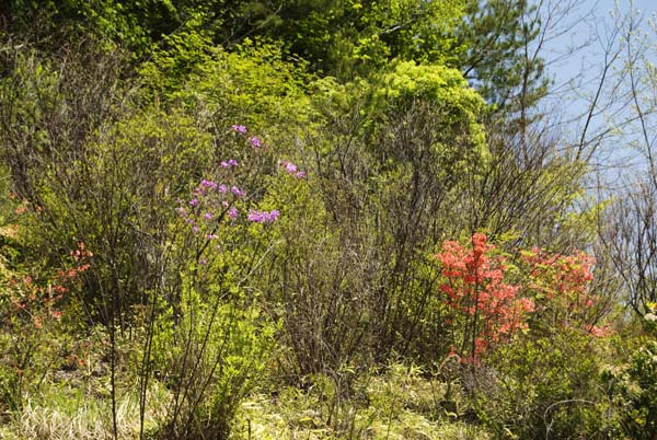 オレンジ色のレンゲツツジとピンク色のミツバツツジも森に彩りを添えている。