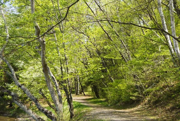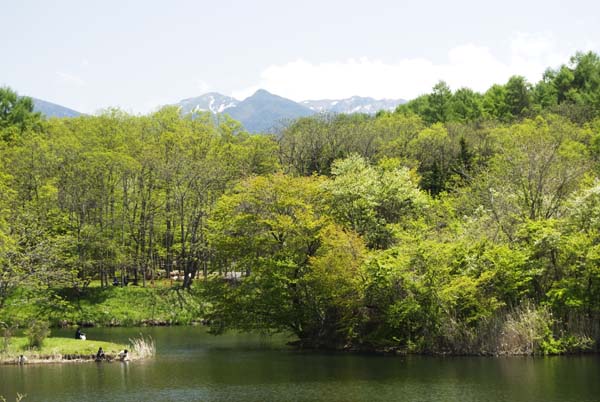 5月の連休終盤、気温も上がって、森の木々は一斉に黄色い芽を吹き始めた。背景の八ヶ岳の残雪も残り少なくなってきた。