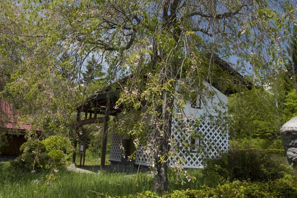 帰りに寄った原村郷土館のマテノクラでは、白壁の蔵の前のしだれ桜が葉桜となっている。