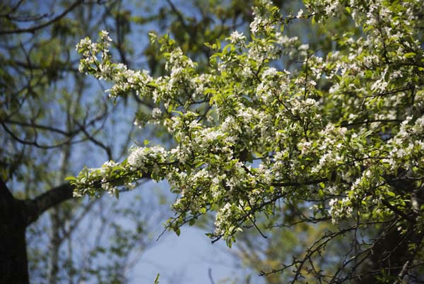 久しぶりに晴れ間が戻った朝、原村の八ヶ岳自然園を歩く。園内では、小梨が木全体に白い花を付けている。