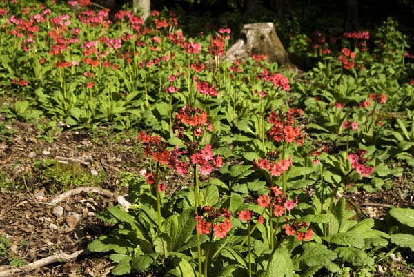 周りの森では、クリンソウが群生し、鮮やかな赤い花を見せている。