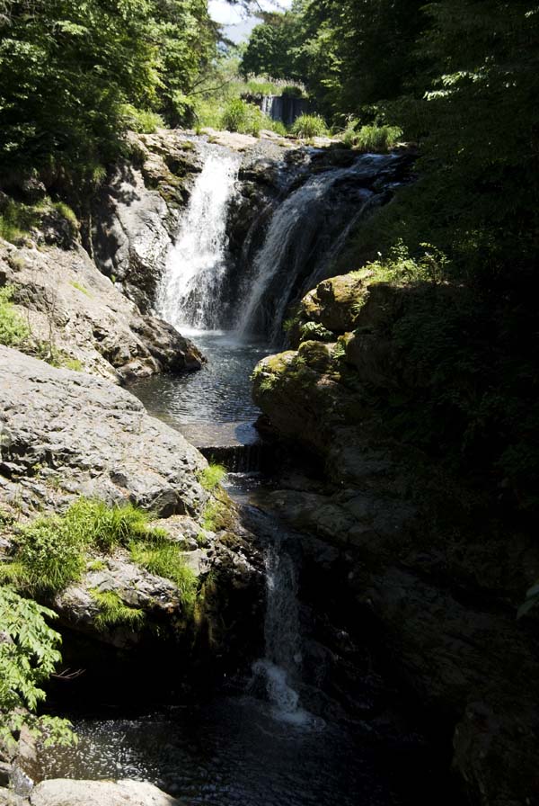 近くを流れる柳川では、新緑を縫って多留姫の滝が豪快な水しぶきを上げている。