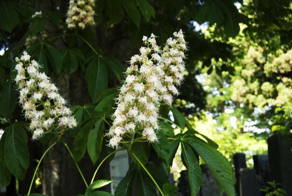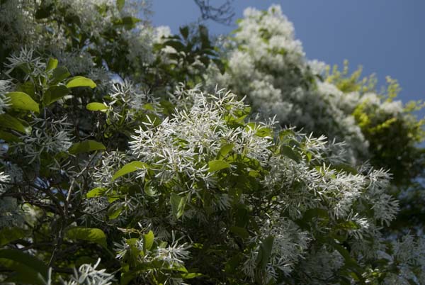 隣には、ナンジャモンジャの木も緑の葉を広げ、白い尖った花を見せている。