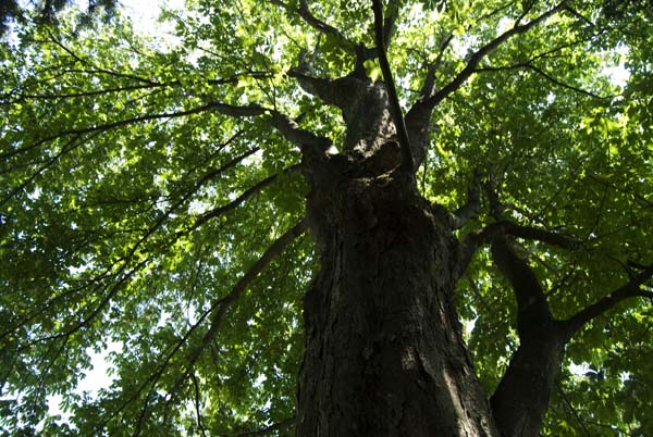 茅野市郊外の長円寺の境内では、栃の巨木が新緑の葉を広げている。