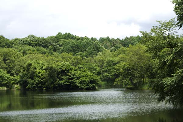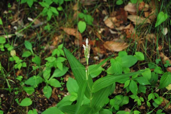 湖畔の草むらでは、ササバギンランが白い花を見せている。