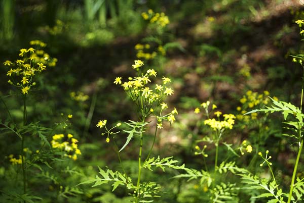 水辺では、背の高いサワギキョウが線香花火のような黄色い花を付けている。