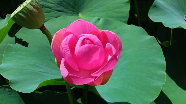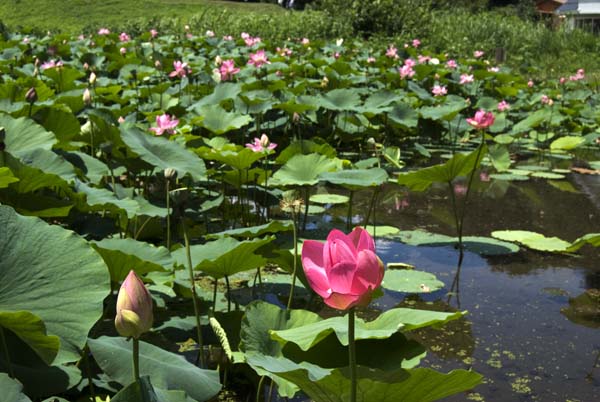 富士見町の井戸尻の縄文遺跡では、大賀ハスが花を開き始めた。咲き始めた大きく真っ赤な花。