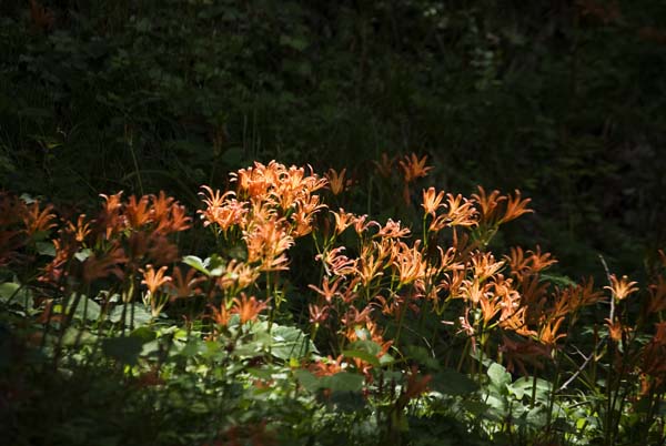 真夏の空が広がる今日この頃、茅野市郊外の里山では、キツネノカミソリが咲き始めた。艶やかな朱色の尖った花である。