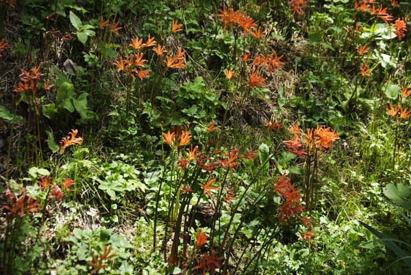 緑色の草が生い茂る中に朱色の花が鮮やかである。