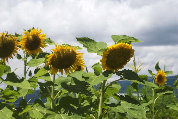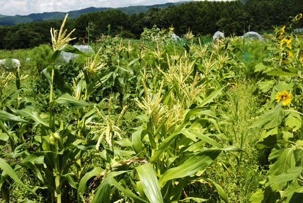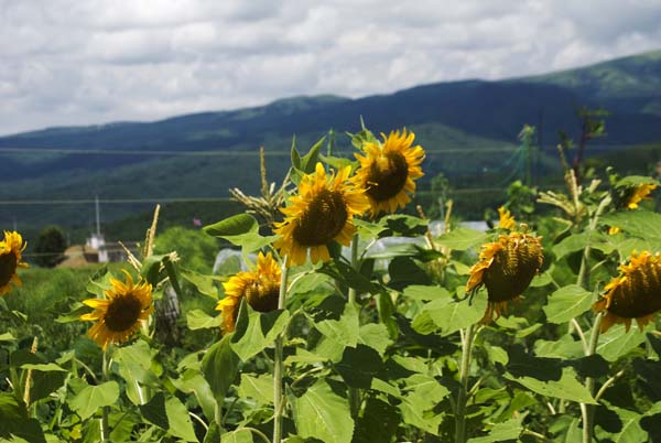 麓の集落で借りた畑の隅に植えたヒマワリが大きな花を広げ始めた。