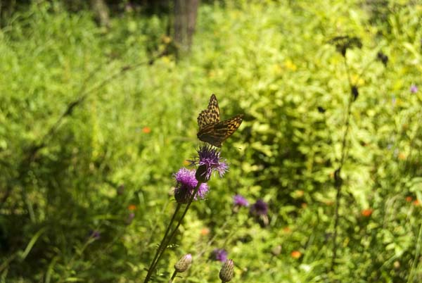久しぶりに晴れ間が戻った日、原村の八ヶ岳自然園を歩く。草むらでは、ヒョウモンチョウがタムラソウの花に吸蜜している。