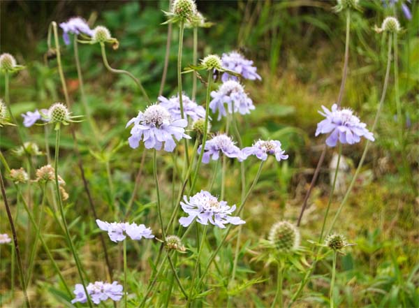 久しぶりに秋空が戻った日、霧ヶ峰を歩く。高原では、薄紫色のマツムシソウが咲いている。