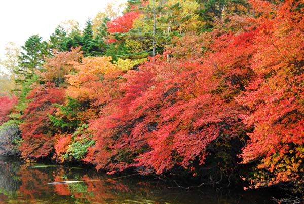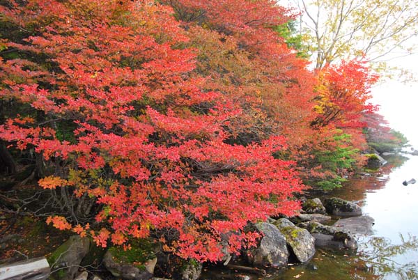 湖畔のドウダンツツジが真っ赤に染まっている。