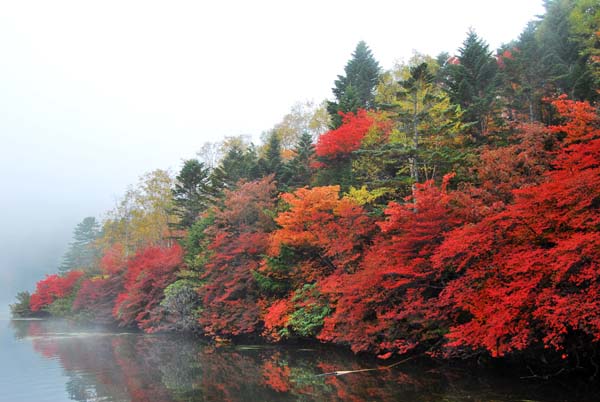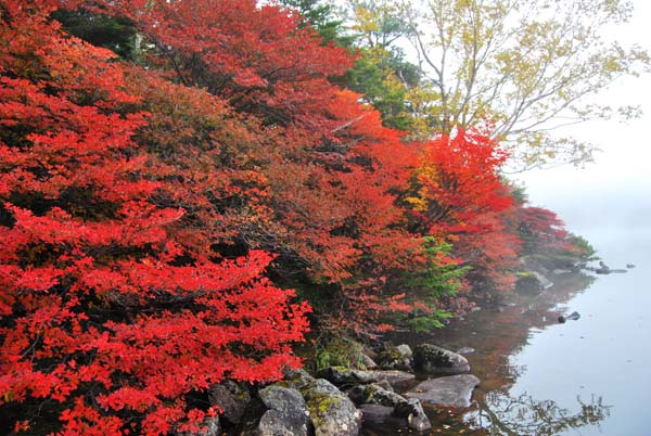 標高2100メートルの白駒池では、紅葉が進んできた。霧が池を包む日、池を訪れる。