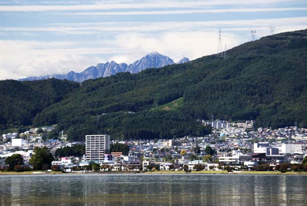 下諏訪の街の背後には、穂高連峰の岩の稜線がのぞいている。