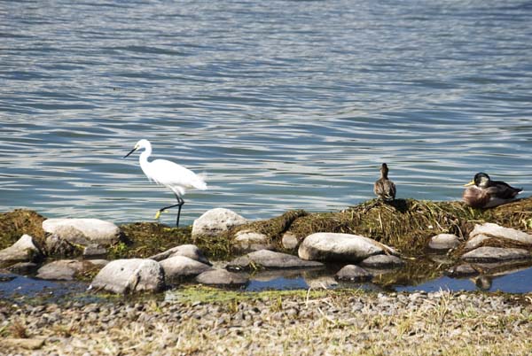 湖岸では、白鳥とカモが仲良く寛いでいる。