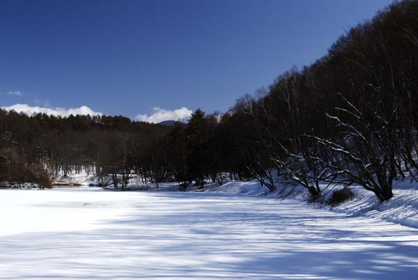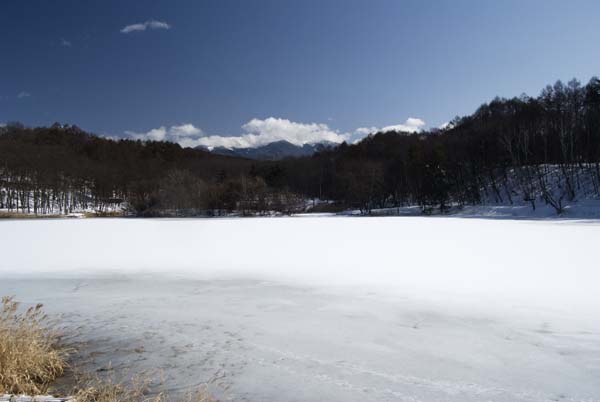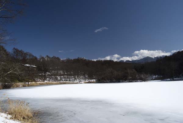 岸辺に近い湖面は、氷が少し溶けてきている。