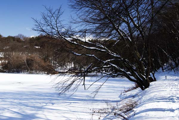 今の時期、湖畔を歩く人はほとんどいず、静かな白い散歩道である。