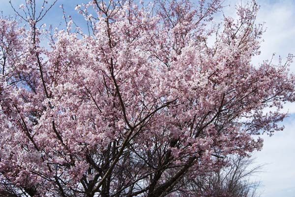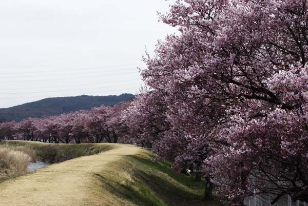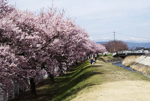 茅野市街地を流れる上川の土手では、早咲きのエドヒガンザクラが咲き始めた。薄いピンク色の花が美しい。
