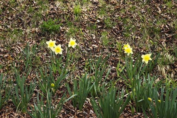 土手の先には、まだ、雪を被った穂高連峰の白い峰が輝いている。
