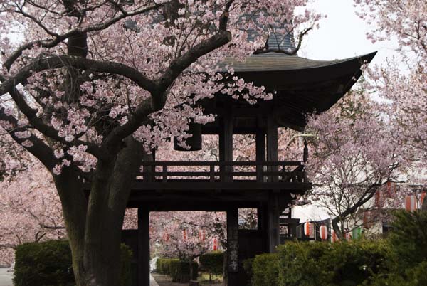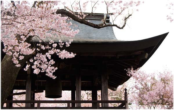 寺の山門の周りの桜が美しい。