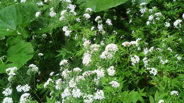 日当たりの良い草叢では、コンロンソウが白い花を群生させている。