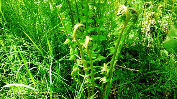 草叢では。ワラビが元気よく芽を伸ばしている。