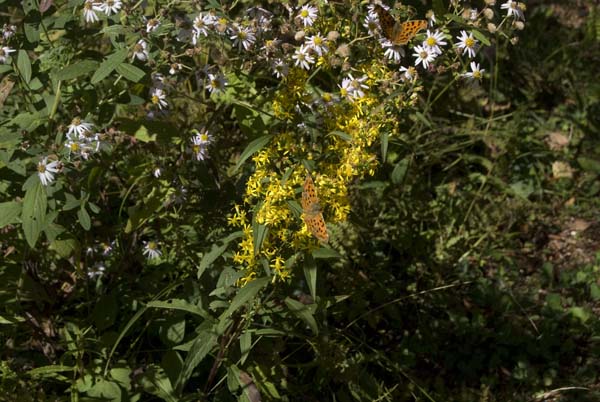 草むらでは、アキノキリンソウでヒョウモンチョウが一心に蜜を吸っている。
