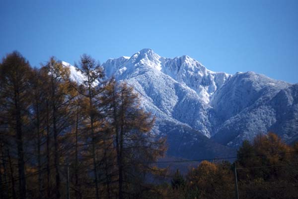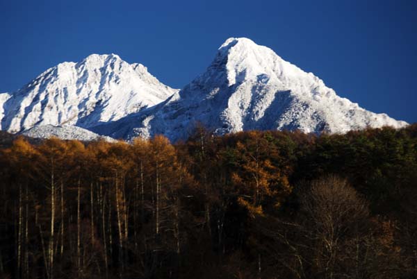 八ヶ岳は、寒波が続き、山々は白く輝き始めた。赤岳(左)と阿弥陀岳(右)。